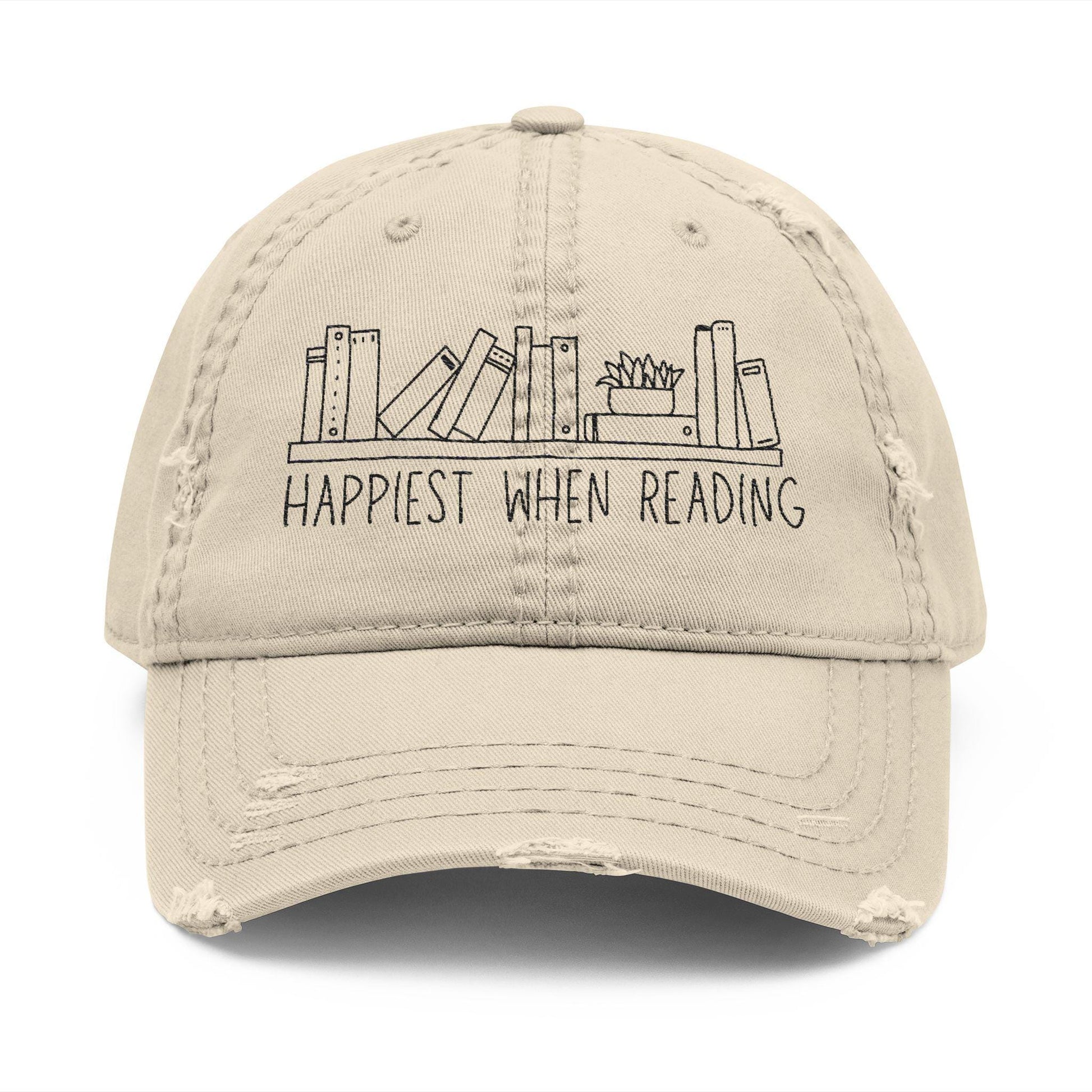 Perfect for book lovers, this distressed Dad Hat with embroidered phrase “Happiest when reading”. Is a great accessory to wear while enjoying your favorite book, or as a gift for the avid reader in your life.